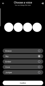 Es probable que esta opción permita al usuario elegir una voz específica para la funcionalidad de conversión de texto a voz de la aplicación. Sugiere un tipo de voz o carácter particular que el usuario puede seleccionar para leer respuestas o mensajes dentro de la aplicación.